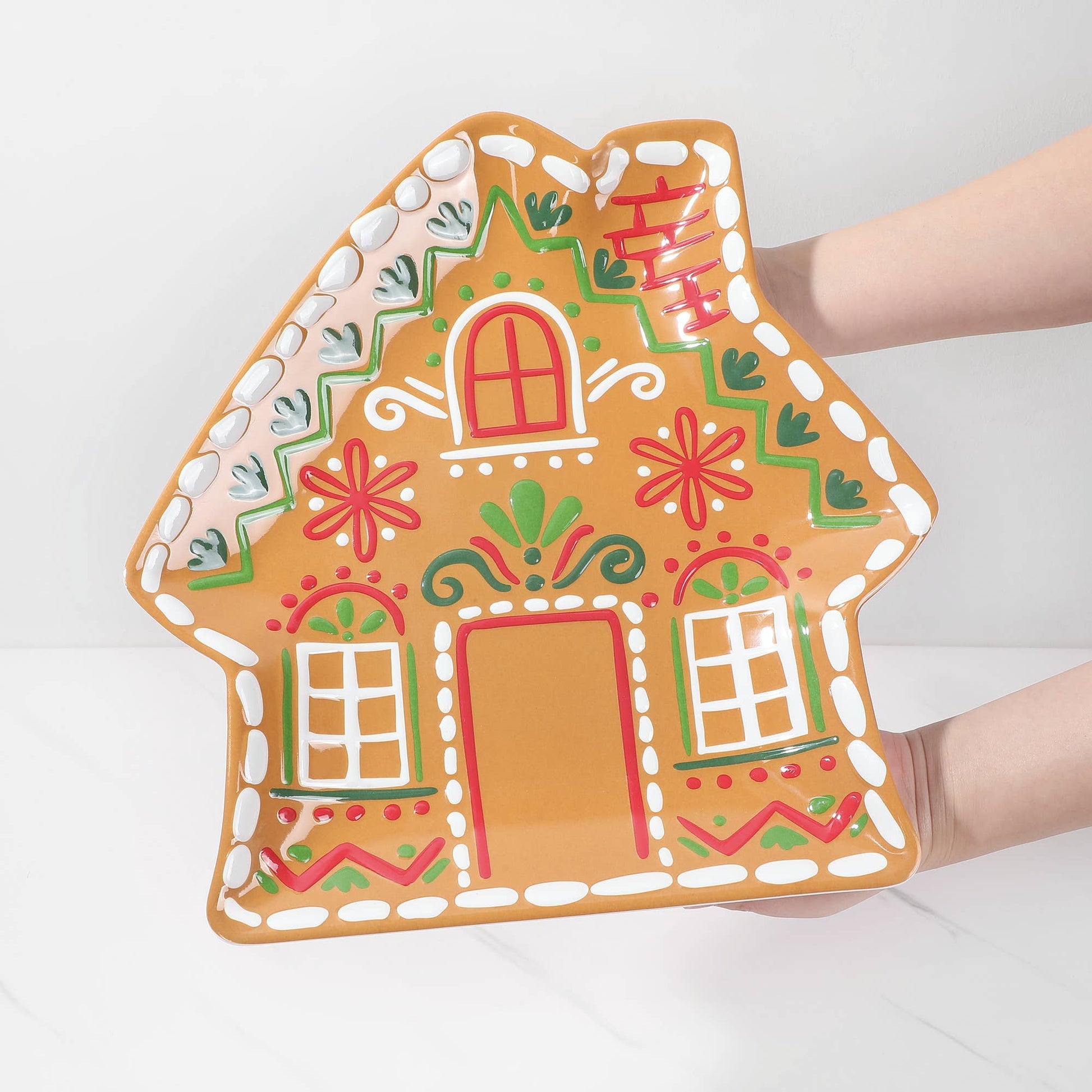 Whimsical gingerbread house plate with vibrant holiday colors and icing-style details. A festive, eye-catching design that brings joy to your Christmas table or dessert display.