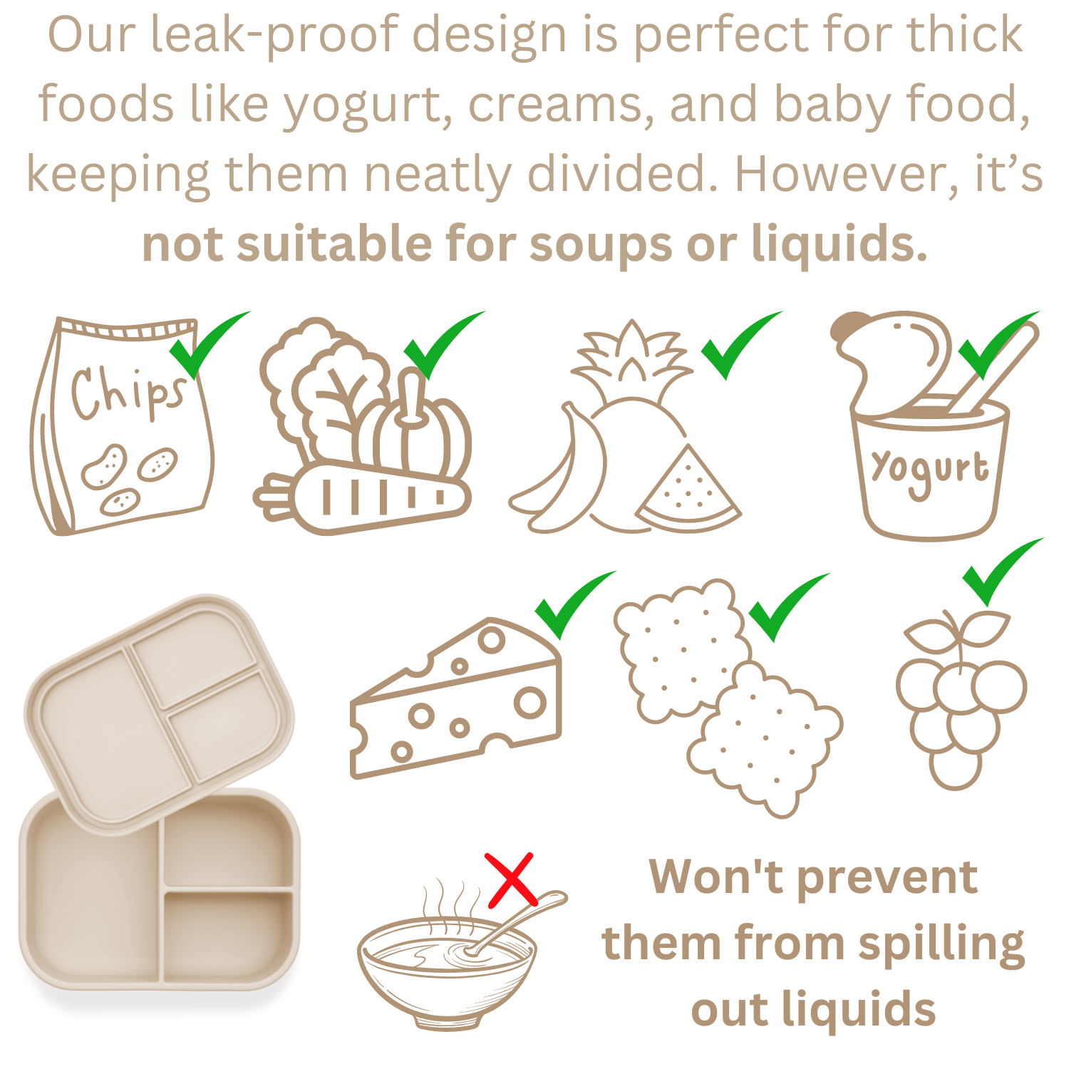 Pack lunches like a pro with the Ali+Oli Leakproof Silicone Bento Box in Coco. This fan-favorite features three smart compartments that keep foods separated and fresh, thanks to its clever lid-channel design. Made from 100% food-grade silicone, it's non-toxic, flexible, and a cinch to clean. Say goodbye to plastic waste—this durable, reusable companion fits snugly in most lunchboxes and handles everything from school days to weekend adventures. Whether you're fueling a growing kid or meal-prepping for yourself, this bento box makes healthy eating on-the-go feel effortless and fun.