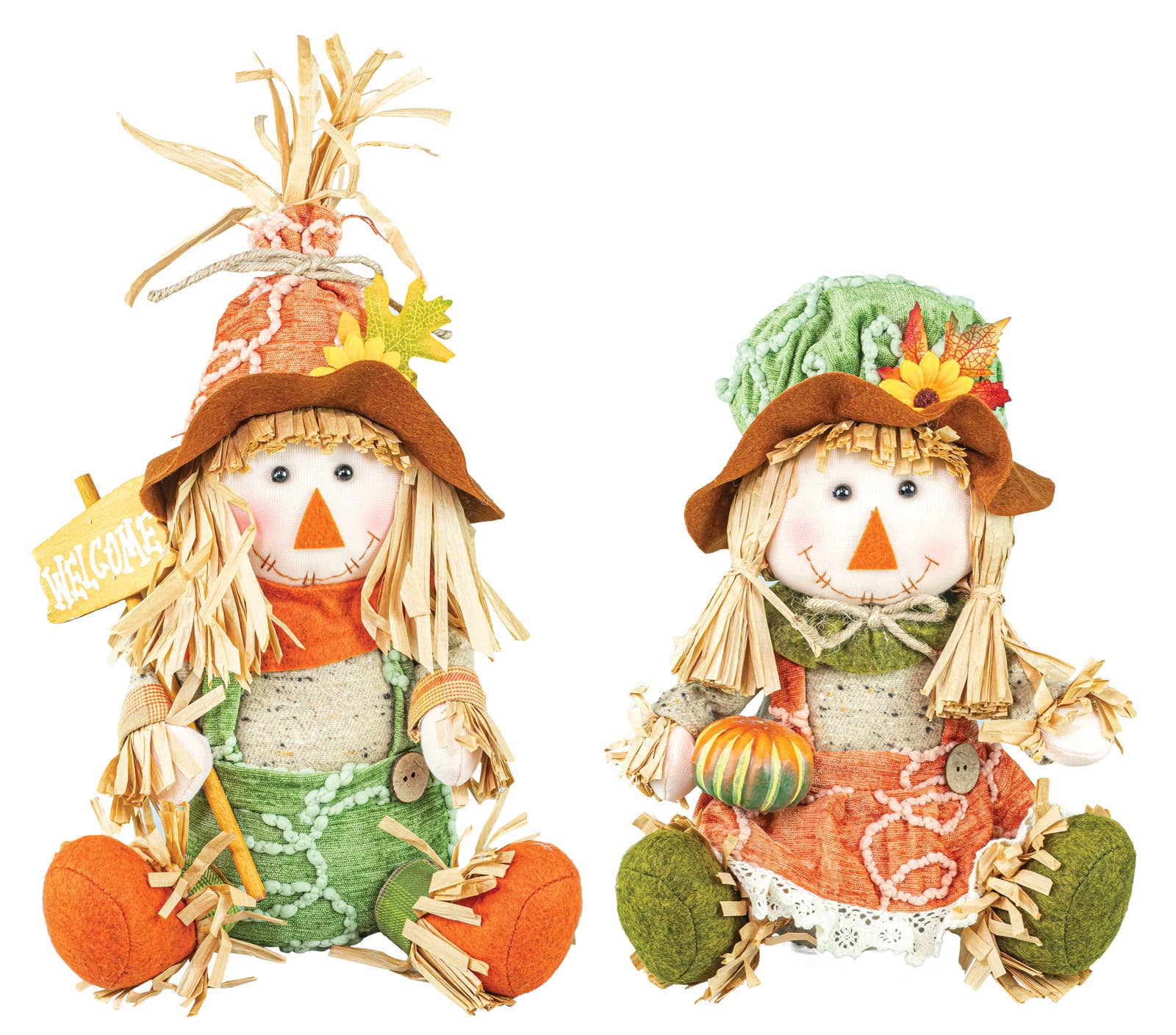 Add a cozy harvest vibe to your space with our charming FARMSTEAD SC SITTER 2 AST! Featuring a lovable duo of rustic scarecrows, these little guys are perfect for perching on shelves, tabletops, or porch rails, bringing a flirty farmhouse flair to your fall decor. Meet Mr. & Mrs., each sporting their own quirky fabric patterns, stitched-on grins, and floppy burlap hats full of character. With weighted bases and steady poses, they stay put wherever you set them. Great for mantelpieces, welcome spots, Thanksgiving tables, or autumn displays—pair them with pumpkins and colorful leaves for an irresistible seasonal scene! Dimensions: 8.5"x7"x11"