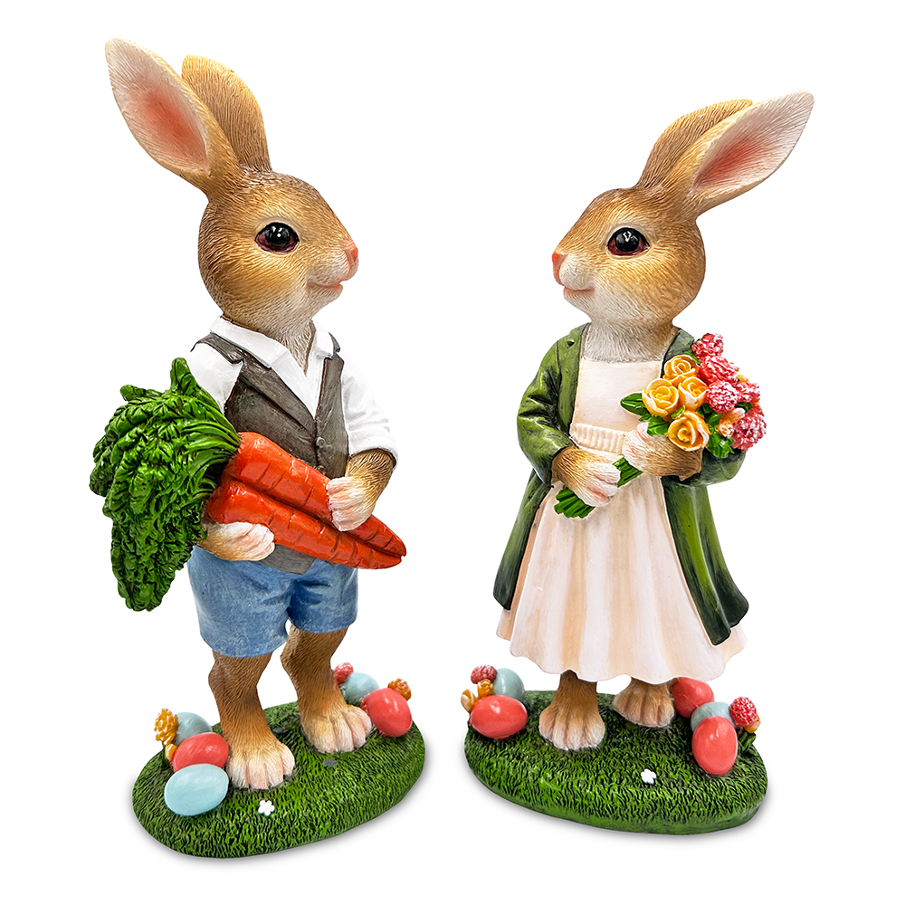 Introduce a touch of whimsy to any space with this charming Country Bunny Pair Figurine. Standing 8 inches tall, this handcrafted resin duo captures two delightful bunnies dressed in rustic attire—one clutching a freshly picked carrot, the other cradling a cheerful flower bouquet. Nestled among colorful Easter eggs, these artisan-painted figures bring springtime joy to gardens, shelves, desks, and mantels year-round. Perfect for seasonal displays, gift-giving, or adding playful personality to your home, office, or nursery. Crafted from durable resin and proudly shipped from the USA.
