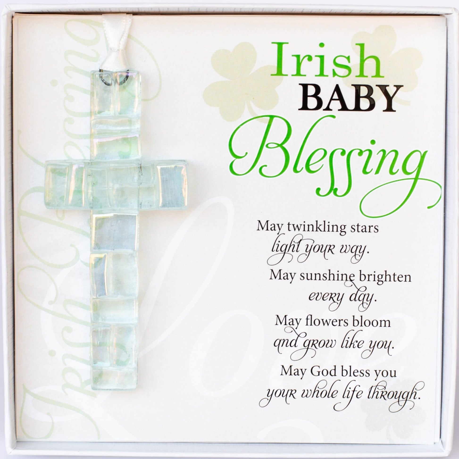Celebrate a special Irish baby boy or girl with this charming gift! Our 4" mosaic glass cross is lovingly handcrafted in the USA, featuring a shimmering clear iridescent design that catches the light beautifully. Hanging from a soft white satin ribbon, it’s perfect to showcase anywhere—whether on a rearview mirror, window, drawer knob, or even a Christmas tree. Alongside the sparkling cross, you’ll find a delightful Irish baby blessing printed on sturdy paper, all tucked inside a neat 5.5x5.5 white gift box with a clear lid. A playful and meaningful keepsake for baptisms, first birthdays, or any precious baby moment.
