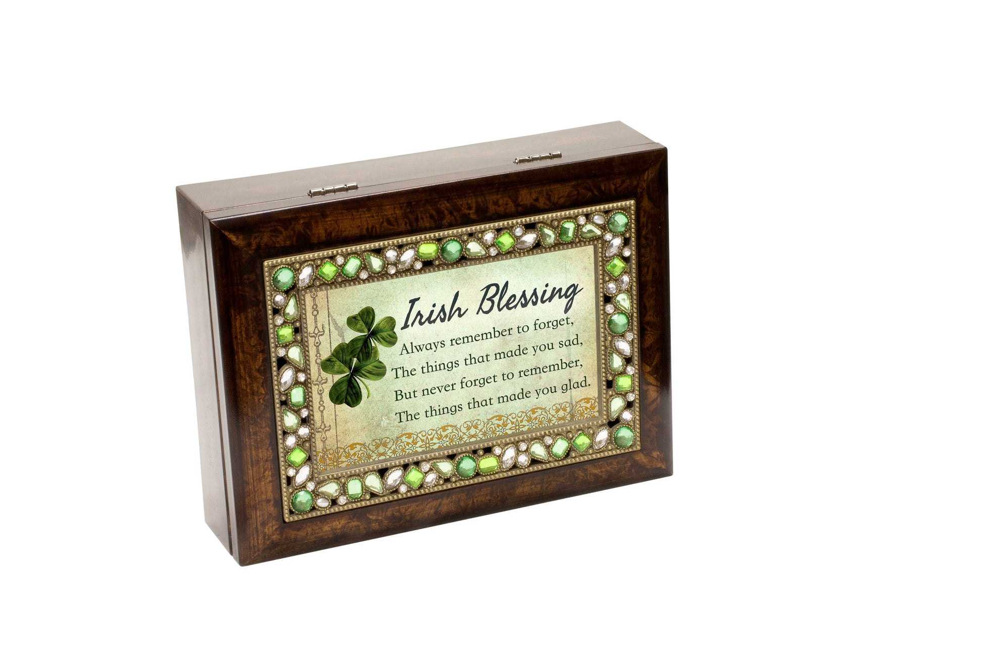 Jeweled Music Box in burl wood finish. Beaded jewels frame the hinged lid. Jewelry box measures approximately 8 x 6 x 2.75 inches; Window opening hold 4 x 6 inch personal photo. Black velvet lined interior; Decorative bun feet are padded to protect table top and shelf surfaces. Individually boxed. Wind-up music box plays Irish eyes.