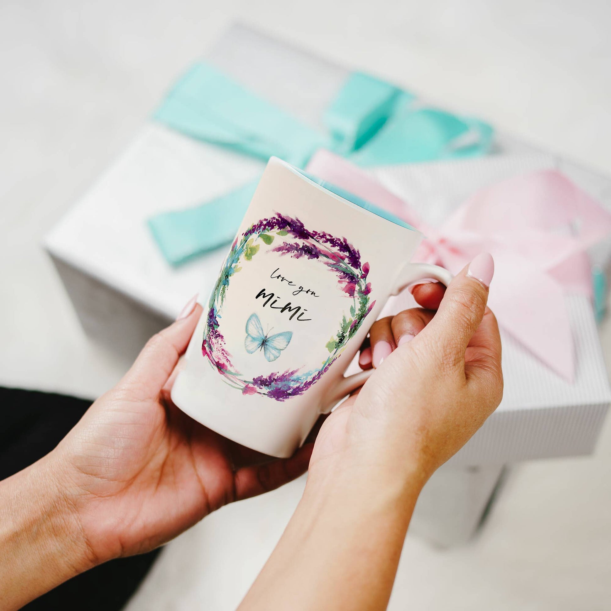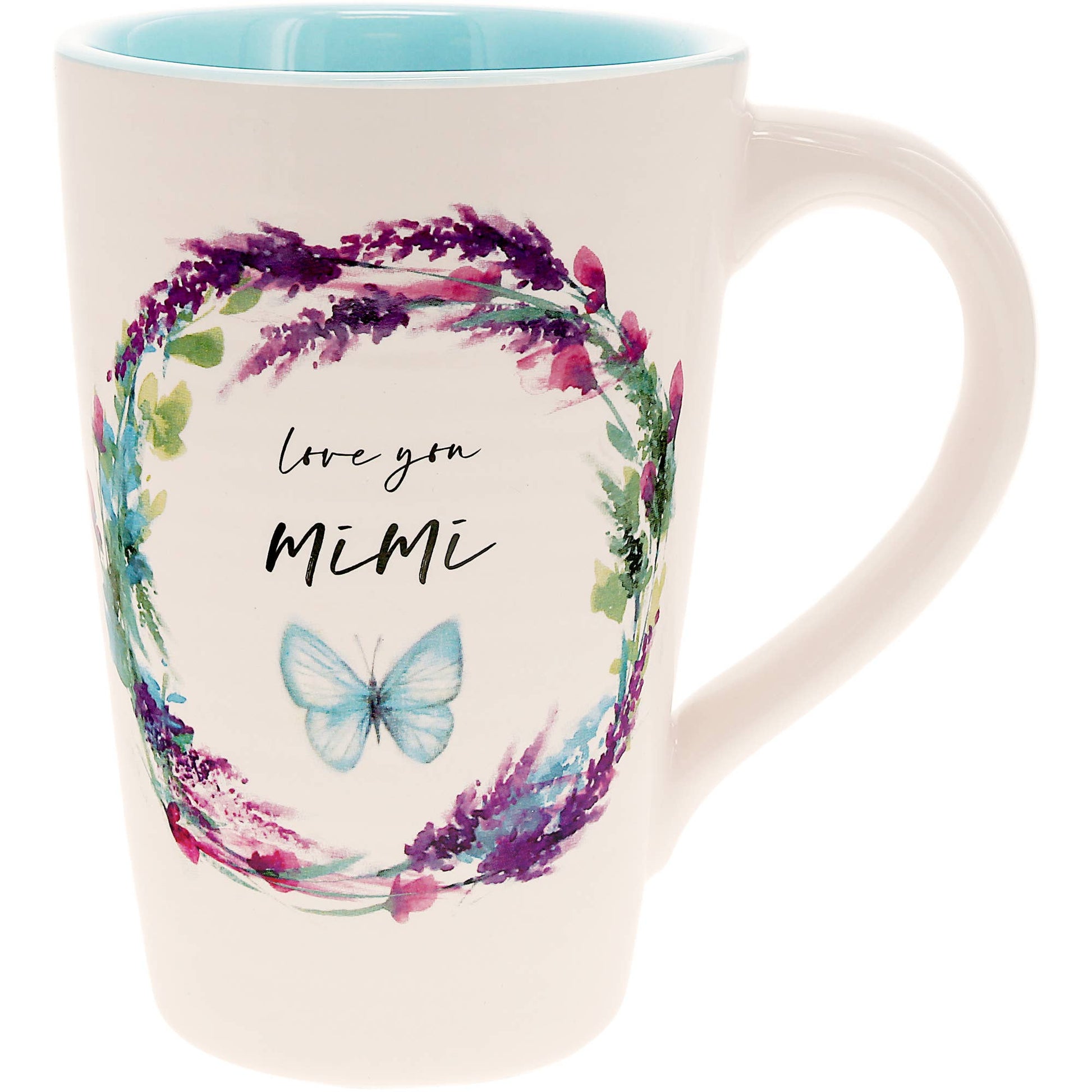 Enjoy your favorite latte in this playful 17 oz stoneware cup featuring a glossy finish and a comfortable, smooth-edged handle. Its ribbed exterior adds a fun texture, while vibrant springtime florals in pink, purple, blue, and green surround a charming blue and black butterfly with the sweet message "Love you Mimi" nestled in the center. The creamy white outside contrasts with a bright blue interior. Safe for microwave and dishwasher use, it arrives ready to gift in a die-cut box.
