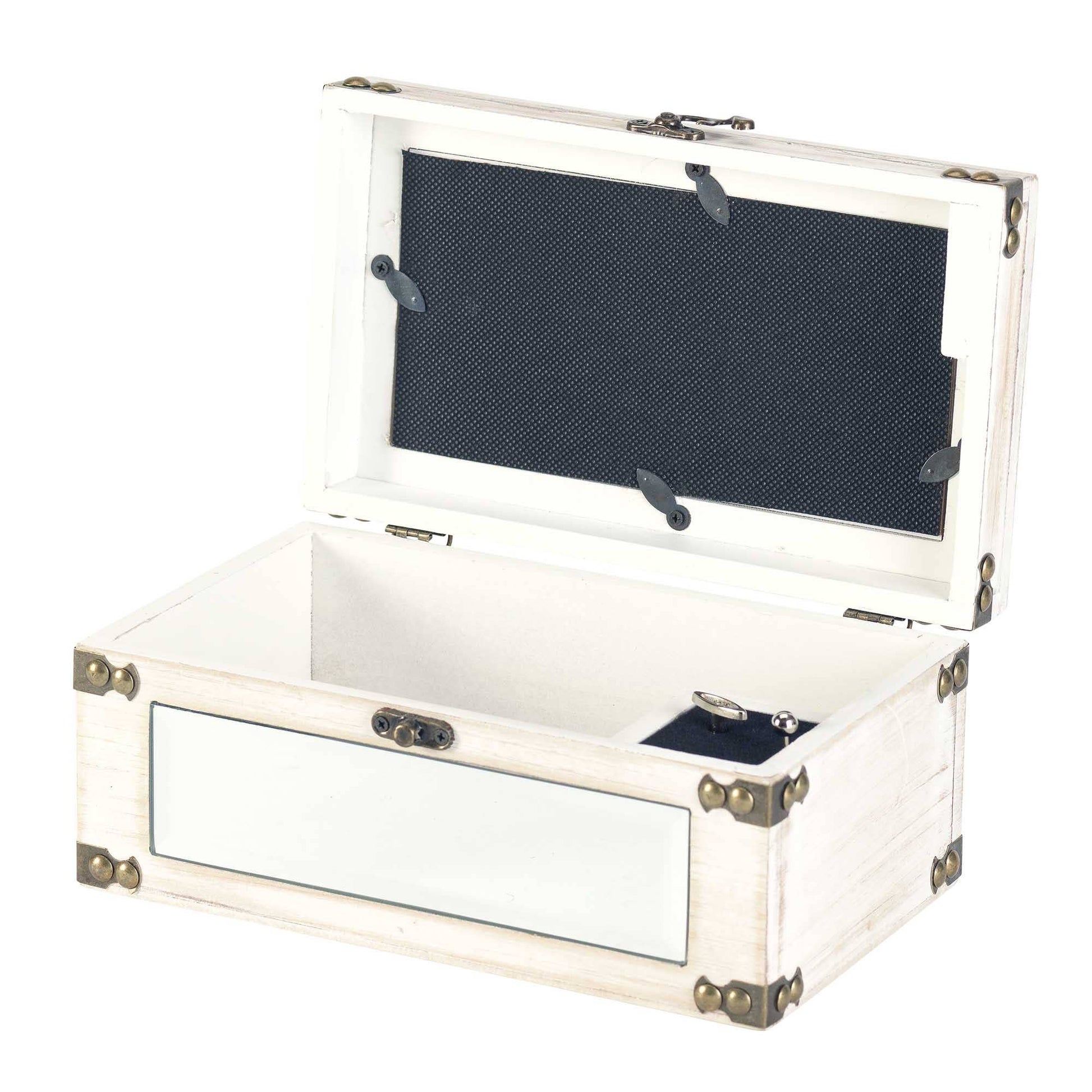This charming music box blends spiritual meaning with timeless design. Crafted from rustic wood with a weathered whitewashed finish and accented by decorative metal hardware, it features a beveled mirror front and hinged lid that doubles as a photo frame. The included art print showcases the beloved Footprints verse against a serene beach backdrop—easily swap it for your own 7 1/4 x 3 1/2 photo thanks to the removable back panel. Wind the key to hear a meaningful melody, while the internal Sankyo movement compartment keeps everything organized. Protective pads safeguard your furniture. At 9 1/2 x 5 1/2 x 4 1/2, it's the perfect keepsake for displaying cherished memories and inspirational moments.