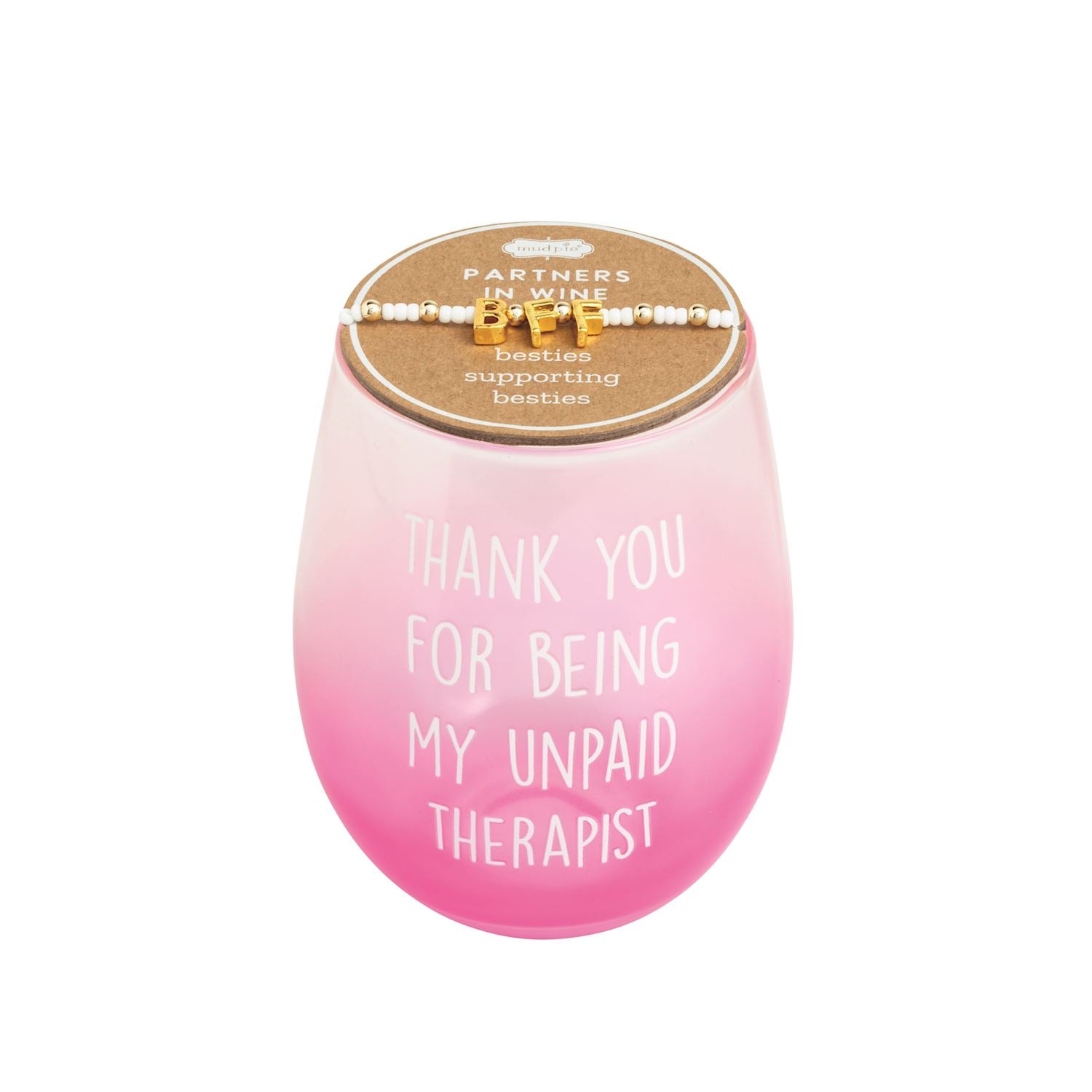 Treat yourself and your bestie to this fun duo—a gorgeous stemless wine glass with a dreamy ombré finish paired with a stretchy beaded bracelet. Perfect for sipping in style and matching with your favorite person.